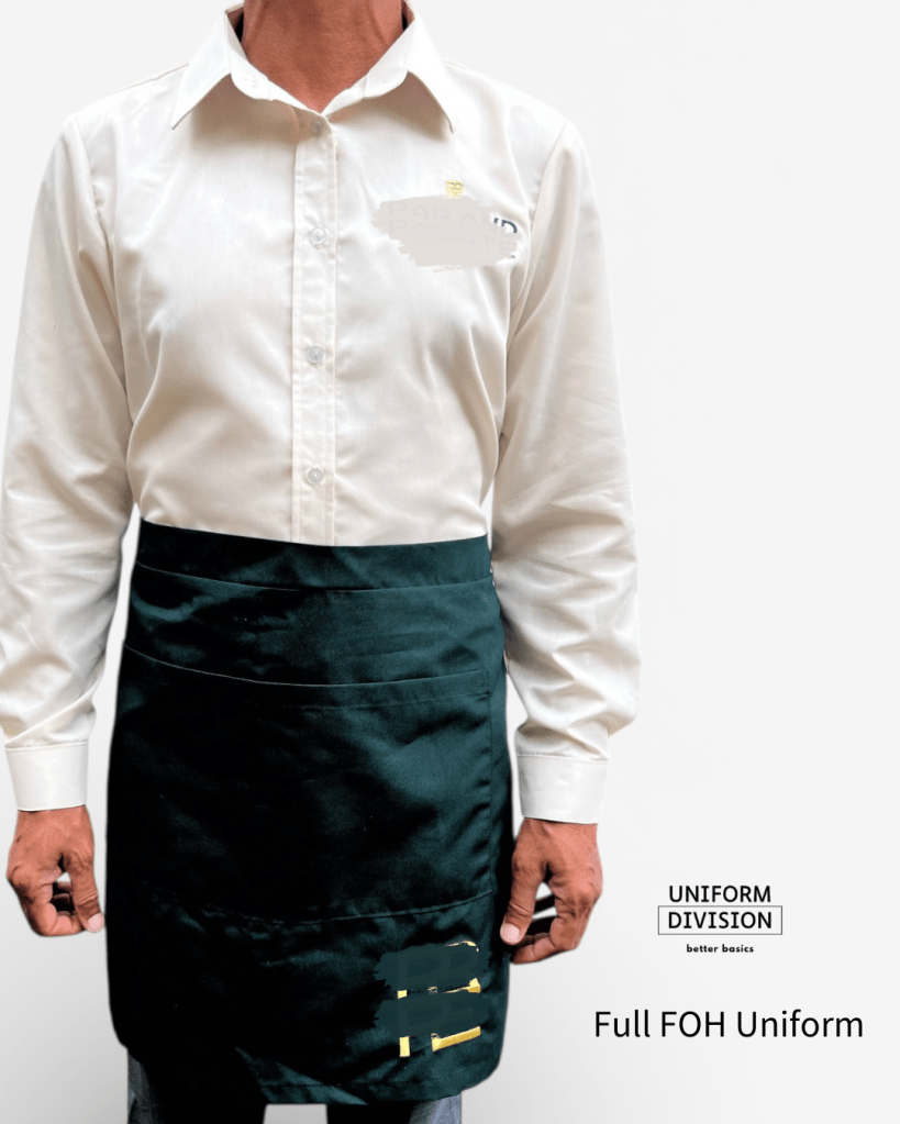 Low MOQ available. We create complete front-of-house uniform sets for waiters, hosts, reception teams, supervisors, managers, and café staff.